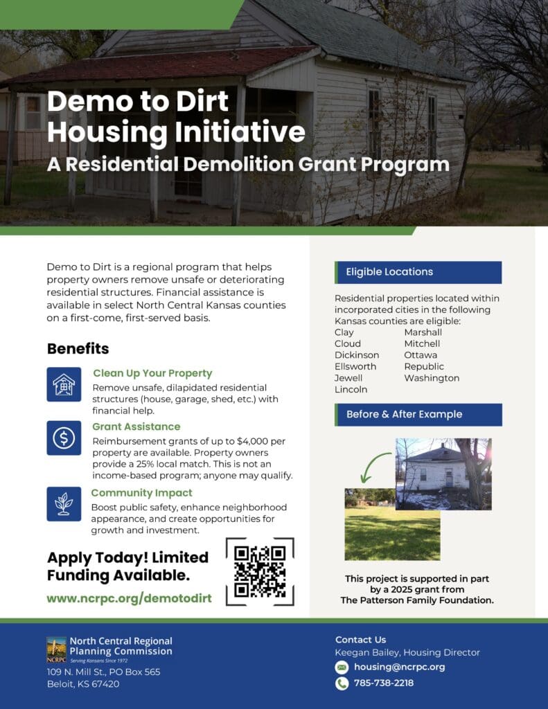 The North Central Regional Planning Commission (NCRPC) in Beloit, Kansas, will administer the program with support from a 2025 grant by The Patterson Family Foundation. Eligible applicants may qualify for reimbursement grants of up to $4,000 toward demolition costs for deteriorated residential homes, garages, and sheds that pose safety risks or detract from neighborhood quality. There are no income requirements for the program. Assistance will be available on a first-come, first-served basis. Property owners are required to contribute a 25% match and cover any costs that exceed the $4,000 grant.