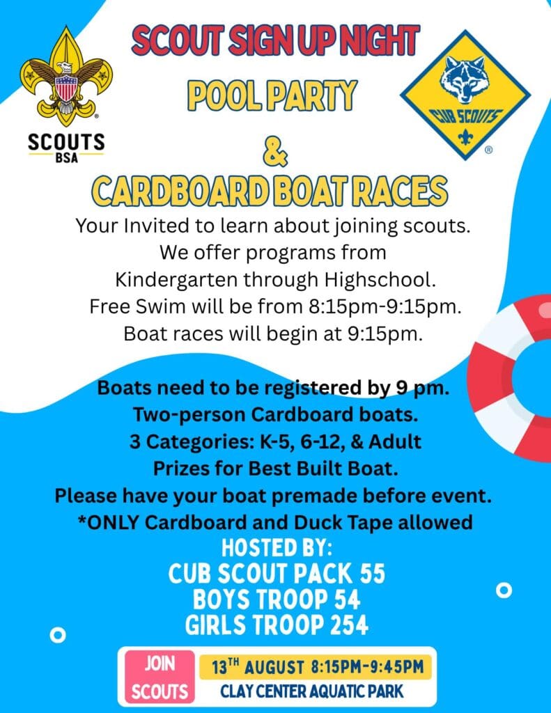 Join the Clay Center Cub and Scout BSA Troops on Wednesday, August 13th, at the Clay Center Aquatic Park for their Scout Sign Up Night, beginning at 8:15 p.m. Children from Kindergarten through High School, and their parents, are encouraged to attend.