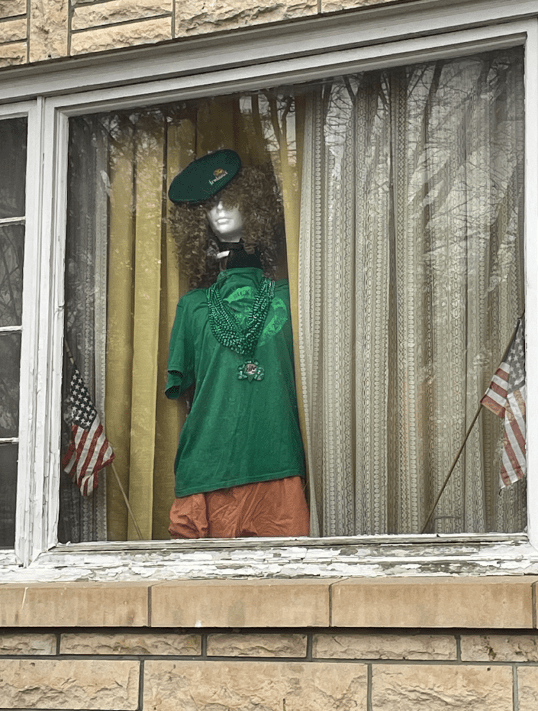 “I saw various houses with mannequins dressed in upstairs windows. I saw this dress form at an antique shop in Barnes, KS and I thought, ‘Maybe I’ll do something like that too,’” he said. “I thought ‘Yeah that’s the ticket’ and wanted to put her in my front window.”