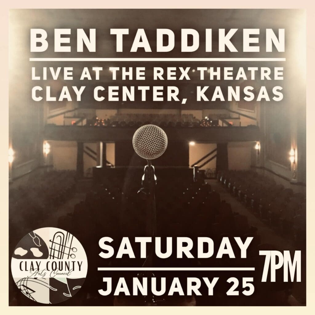 Thanks to the Clay County Arts Council and Rex Theatre Taddiken will bring his talents back home, performing at the Rex on Saturday, January 25th at 7:00 p.m. He said he performs solo and looks very forward to playing back home. Taddiken spoke a little about what the audience can expect.
