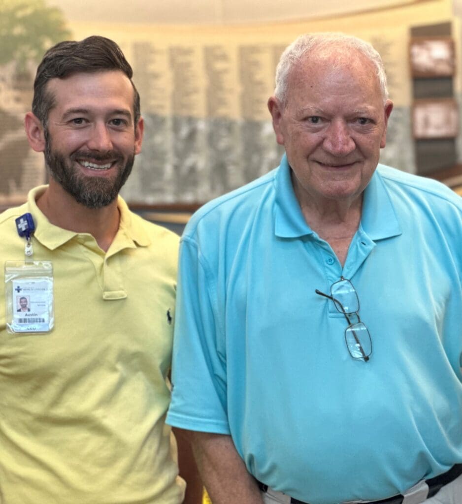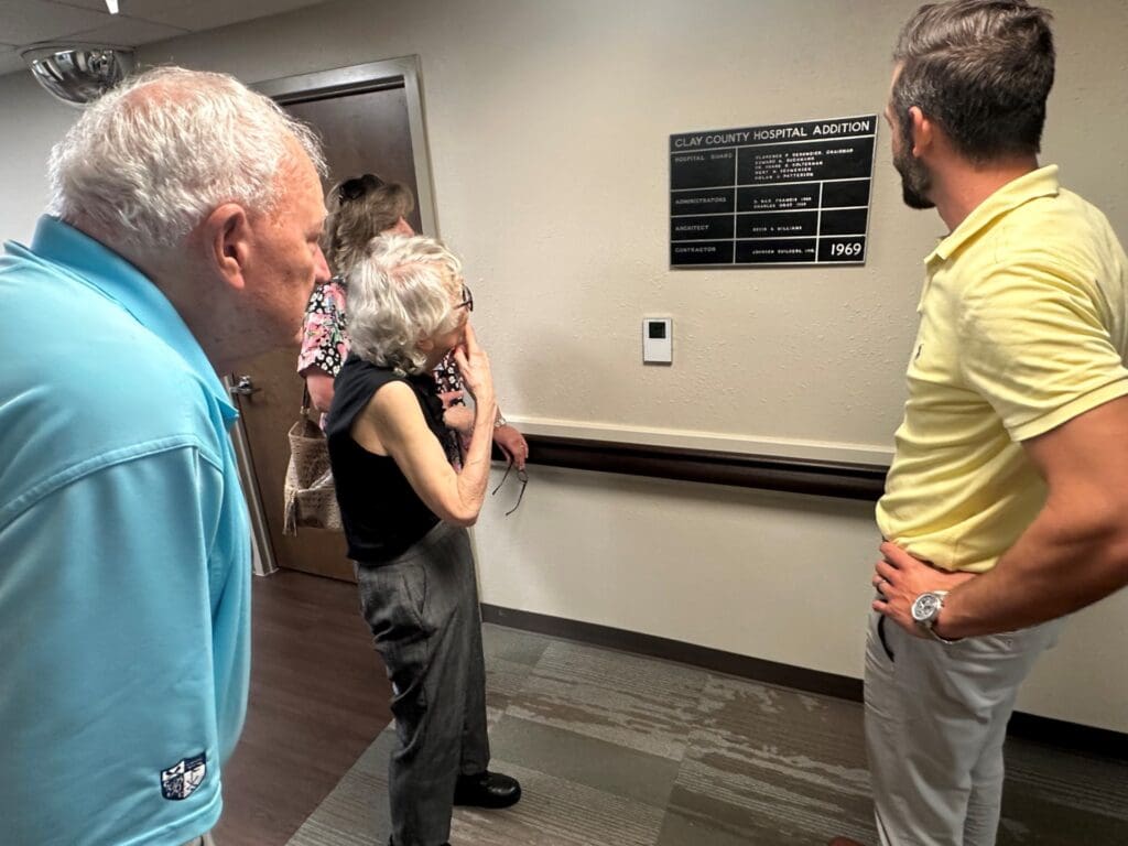 Clay Center, KS – D. Max Francis was the Administrator of Clay County Hospital from 1966-1968. The Miltonvale native and Clifton High School graduate’s name still hangs on the wall of a commemorative plaque in the east hall. Once used for inpatient beds, the rooms in the east hall now serve as treatment rooms for occupational and speech therapy, a therapy waiting room, and several offices. After learning Francis was visiting Clay Center, CCMC Volunteer Beverly Lang tracked him down to extend an invitation to the hospital and visit with CEO Austin Gillard.
