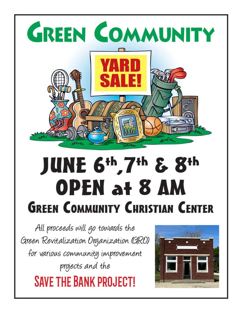 Residents of Green are preparing for the Green Community Yard Sale, which will run from Friday, June 6th, through Sunday, June 8th. The Yard Sale will take place at the Green Community Christian Center, with doors opening at 8:00 a.m. each day.