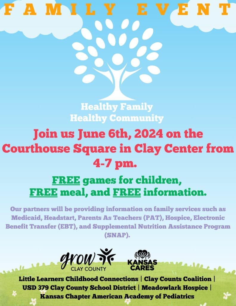 The event will feature free food for families and games for children while parents talk with representatives from Grow Clay County, Little Learners Childhood Connections, Parents as Teachers, USD 379, the Clay Counts Coalition, Meadowlark Hospice, mental health professionals, and more.