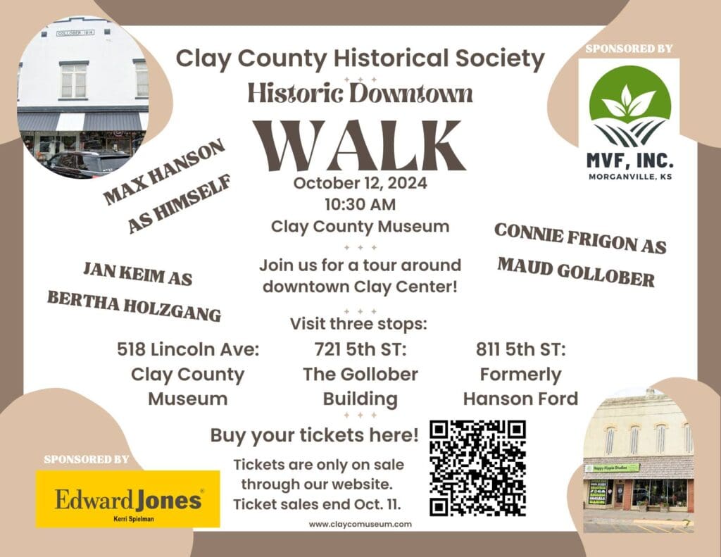 On Saturday, October 12th the Clay County Historical Society will host a guided Historic Downtown Walk, touring historical buildings of downtown Clay Center. The walk will begin at the Clay County Museum at 10:30 a.m.