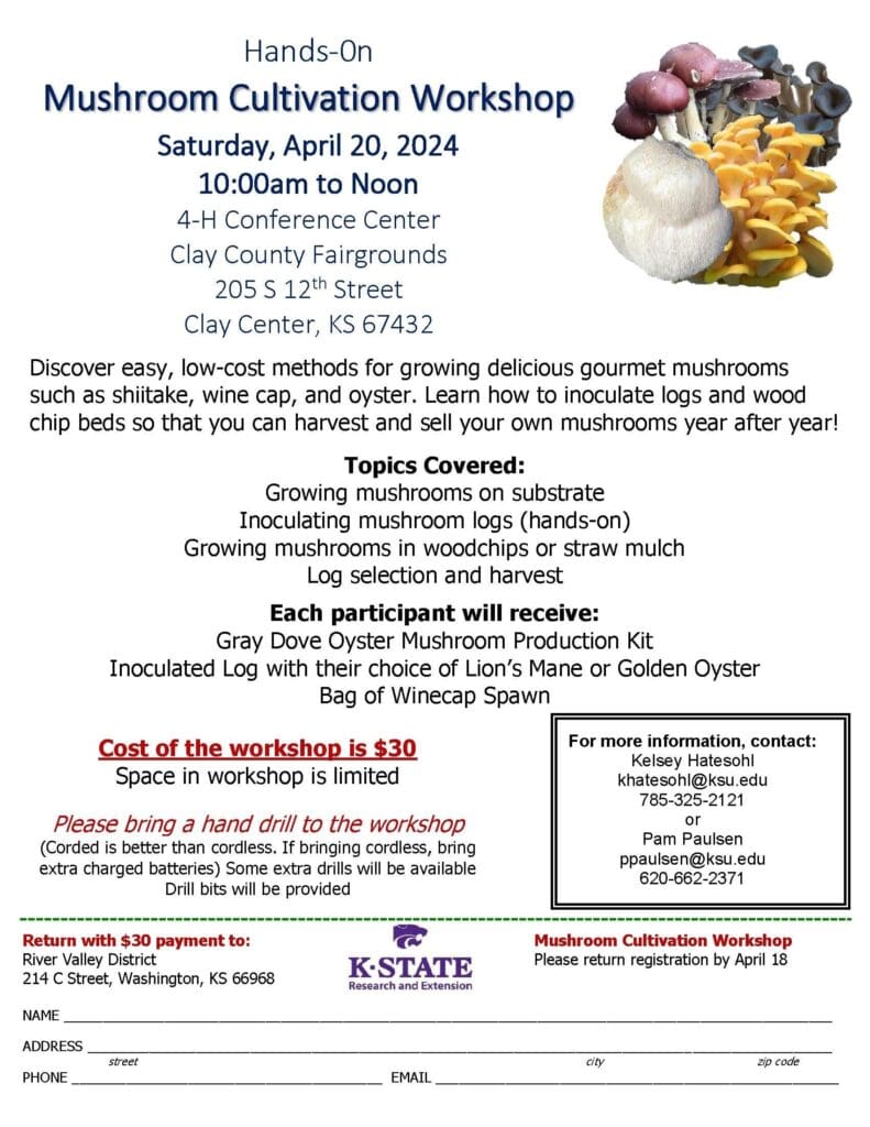 The K-State River Valley District will be hosting a Mushroom Cultivation Workshop in Clay Center on Saturday, April 20th. The Workshop will be held from 10:00 a.m. to 12:00 p.m. at the 4-H Conference Center on the Clay County Fairgrounds.