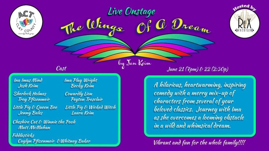 The cast and crew of ACT Clay County are getting ready for their Live summer production, ‘The Wings of a Dream,’ with two showings at the Rex Theatre. The first production will take place on Saturday, June 21st at 7:00 p.m., followed by a showing on Sunday, June 22nd at 2:30 p.m.