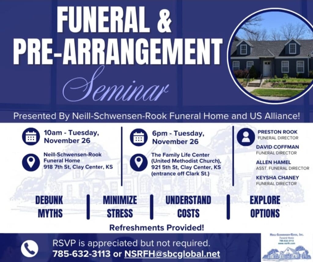 Neill-Schwensen-Rook Funeral Home, in partnership with the US Alliance Life & Security Company, will host two informational Funeral and Pre-Arrangement Seminars on Tuesday, November 26th in Clay Center. This first seminar will take place at the Funeral Home at 10:00 a.m., with the second seminar occurring at 6:00 p.m. at the United Methodist Church Family Life Center.