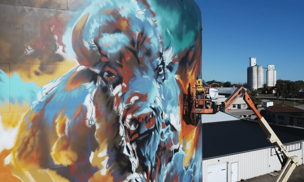For the current mural, featuring Kansas bison and a thunderhead, that meant outlining animals, clouds, land, and more.