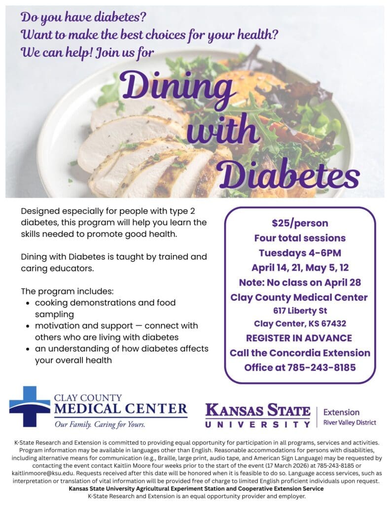 The River Valley Extension District will hold a four-part program designed for people with type 2 diabetes titled ‘Dining with Diabetes.’ Sessions will be held at Clay County Medical Center in Clay Center on Tuesdays, April 14th, 21st, and May 5th, 12th, from 4:00 to 6:00 p.m.