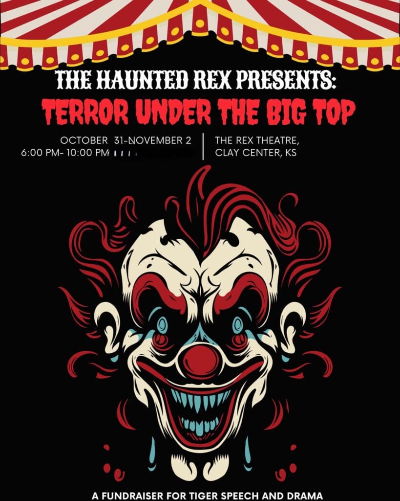 Clay Center Community High School’s Tiger Speech and Drama class is gearing up for its annual “Haunted Rex” haunted house fundraiser. This year’s theme is “Terror Under the Big Top,” bringing brave attendees a bit of circus fright as they tour the Rex. The Haunted House will be open from October 31st to November 2nd, with hauntings occurring from 6:00 to 10:00 p.m. each evening.