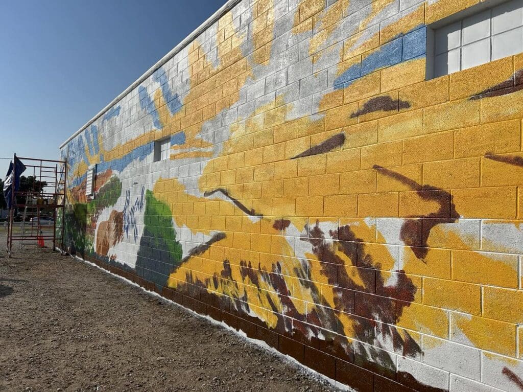 The latest work in the Mural Movement’s collection is being created by Clay County artist and retired USD 379 Art Educator Tracy Lebo of Wakefield. She has been creating murals since the 80s when she was in college at Kansas State University, painting backdrops at McCain Auditorium for various productions. This is Lebo’s third painted work with the Mural Movement. However, she has been involved in other ways. “As an art educator in Clay Center for 35 years, it’s really neat to see people in town just step up, like the zoo, the hospital, and the swimming pool. Once we got one mural going, which was kinda cool, that first one that said ‘Clay Center, ’ my kids got to help design that and put the bronze tiger sculpture within the letters of the design.”