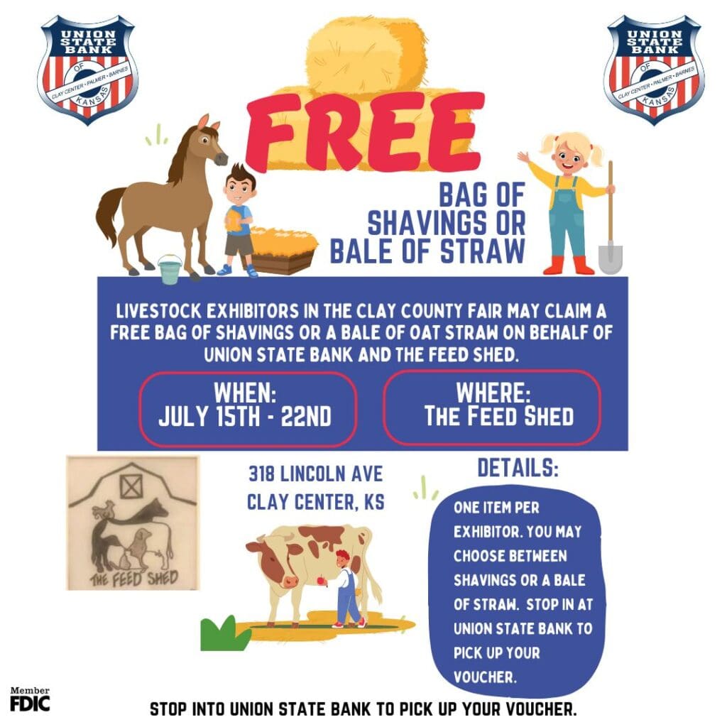 Union State Bank is currently giving out vouchers to Washington and Clay County 4-H members for a free bale of straw or a bag of shavings from the Feed Shed in Clay Center.