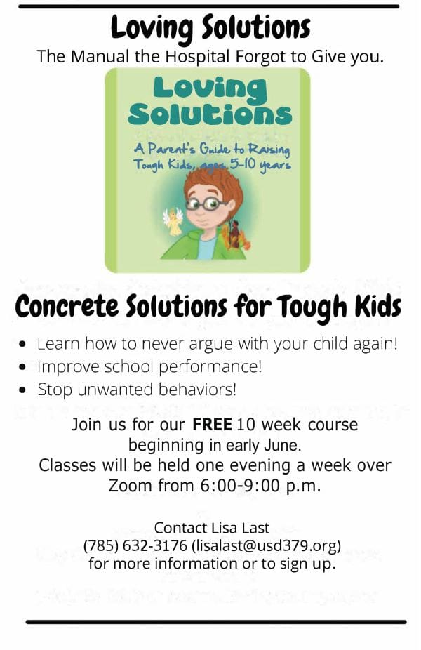 This summer, USD 379 will host a free 10-week Zoom course for parents who may be struggling with child behaviors. Beginning in early June, USD 379 will offer another “Loving Solutions” course for parents of children aged 4 to 11.