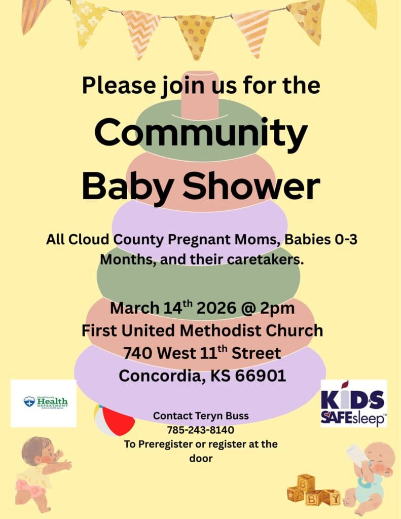 The Cloud County Health Department will host a Community Baby Shower at the First United Methodist Church in Concordia, Saturday, March 14th, at 2:00 p.m.