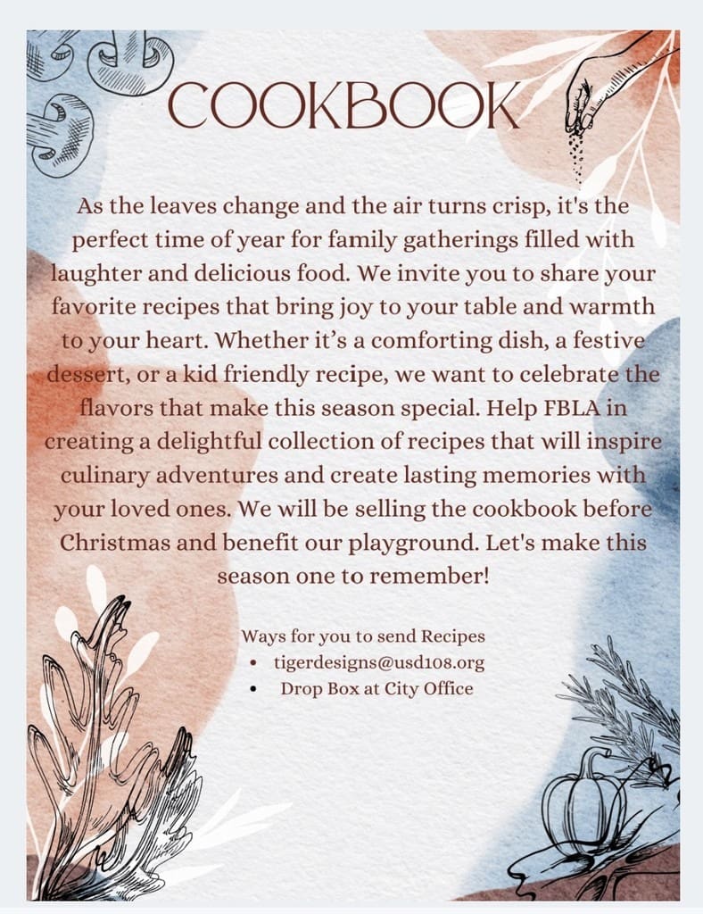 Help local FBLA members complete their community service project by dropping off or sending recipes. The completed cookbooks will make a great addition to anyone’s kitchen and will help local students and the community. Keep up to date with their progress on USD 108’s Facebook page.