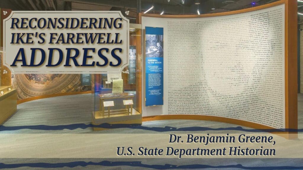 Dr. Benjamin Greene will join us virtually as we take an in-depth look at Ike’s Farewell Address. Ike’s caution about the influence of a “military-industrial complex” remains a compelling and controversial aspect of his efforts at waging peace. Historians and commentators continue to debate the origins of the term, Eisenhower’s purpose for including it in his speech, and the lessons it holds for us today. Curiously, few note that his most famous presidential address included a second warning. Eisenhower also cautioned Americans that the growing influence of government-sponsored scientific research risked making public policy the “captive of a scientific-technological elite.” This Lunch and Learn discussion of his speech centers on Eisenhower’s profound disappointment at his administration’s lack of progress on disarmament and the forces that he believed frustrated his final efforts at waging peace.