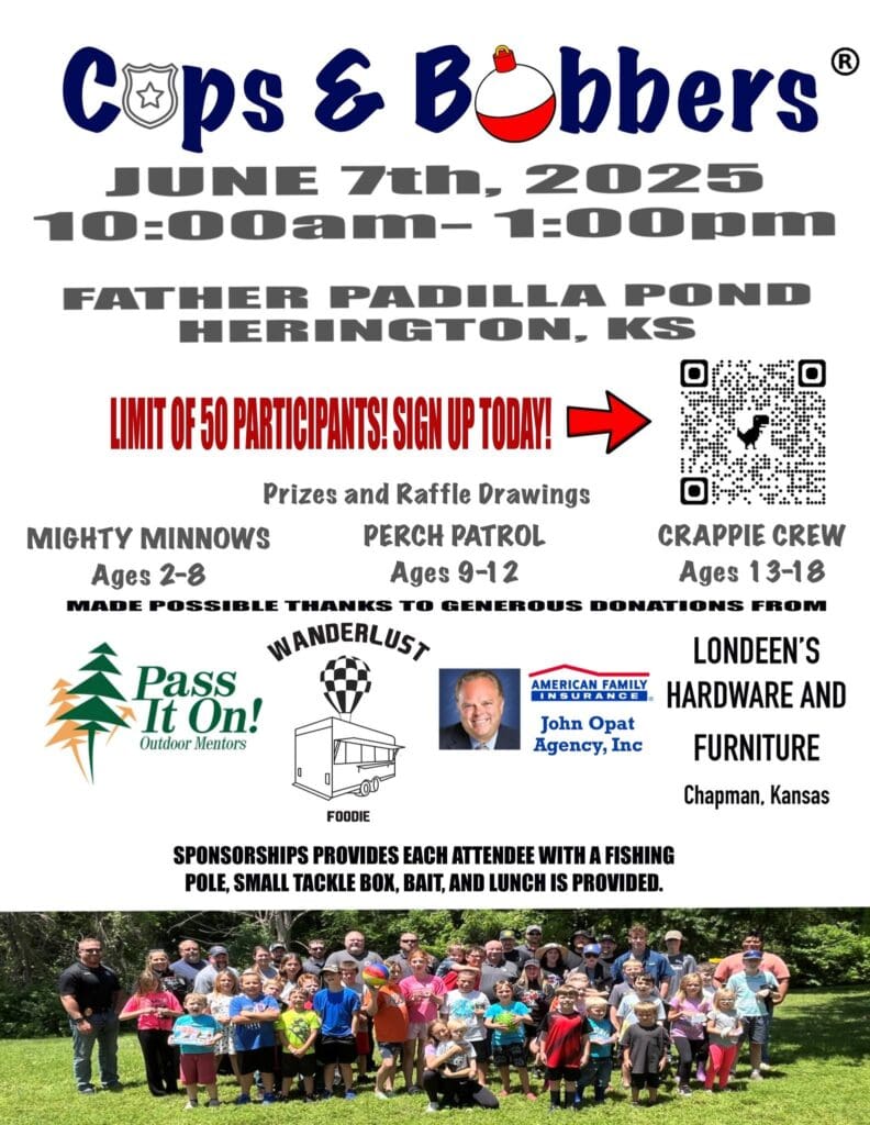 On Saturday, June 7th the Dickinson County Sheriff’s Office will host its “Cops & Bobbers” youth fishing event at Father Padilla Pond in Herington from 10:00 a.m. to 1:00 p.m. Dickinson County youth aged 2 to 18 are welcome, with all fishing tackle being provided.