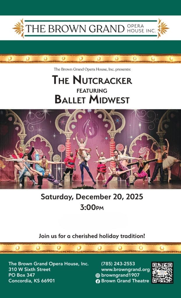 The Brown Grand Opera House, Inc. is excited to end 2025 with a holiday favorite: THE NUTCRACKER. Join us at the Brown Grand Theatre (310 W. 6th Street, Concordia) on Saturday, December 20th at 3:00PM for Ballet Midwest’s presentation of THE NUTCRACKER.