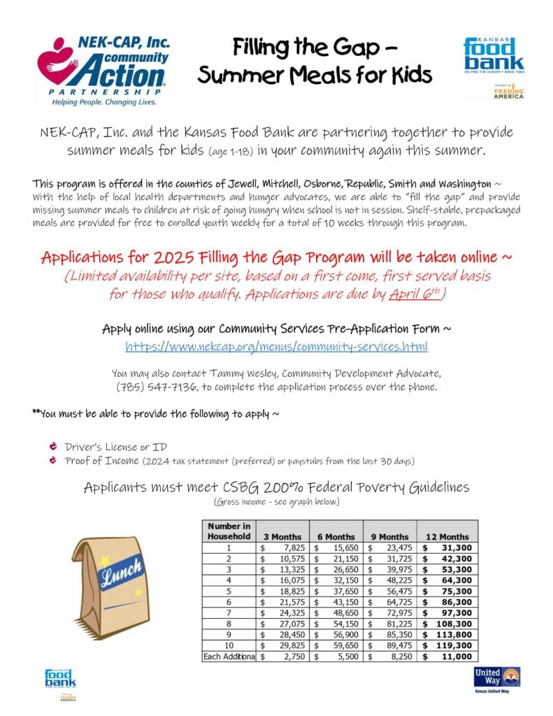 NEKCAP, Inc. and the Kansas Food Bank have partnered up to offer “The 2025 Filling the Gap Program.” The program will offer free summer meals to children in Washington and Republic Counties, along with other area counties, who meet certain income guidelines. The program provides shelf-stable prepackaged meals to kids aged 1-18 for 10 weeks during summer.