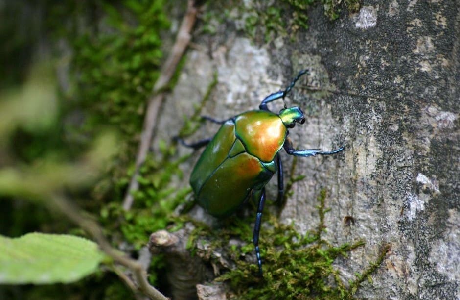 Green June Beetles’ larvae are cream-colored and range from one-quarter to 2 inches long. They transform into nearly one-inch adult Green June Beetles. These beetles have velvety-green oval bodies with orange-yellow edges and reddish-brown wing covers. Larvae damage lawns by tunneling underground, feeding on roots, and causing surface mounds. Adults skeletonize leaves and may feed on fruit trees. Domenghini suggests applying carbaryl (Seven Dust) or malathion to deter their impact.