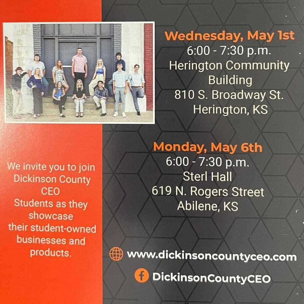 The class will host two tradeshows to cater to residents and businesses countywide. The first will take place on Monday, May 1, from 6:00 to 7:30 pm at the Herington Community Building, located at 810 S. Broadway St in Herington. The second will be held on Monday, May 6, from 6:00 to 7:30 pm at Sterl Hall, located at 619 N Rogers Street in Abilene. Attendees will have the opportunity to browse and shop the students’ businesses as they present their products and services.