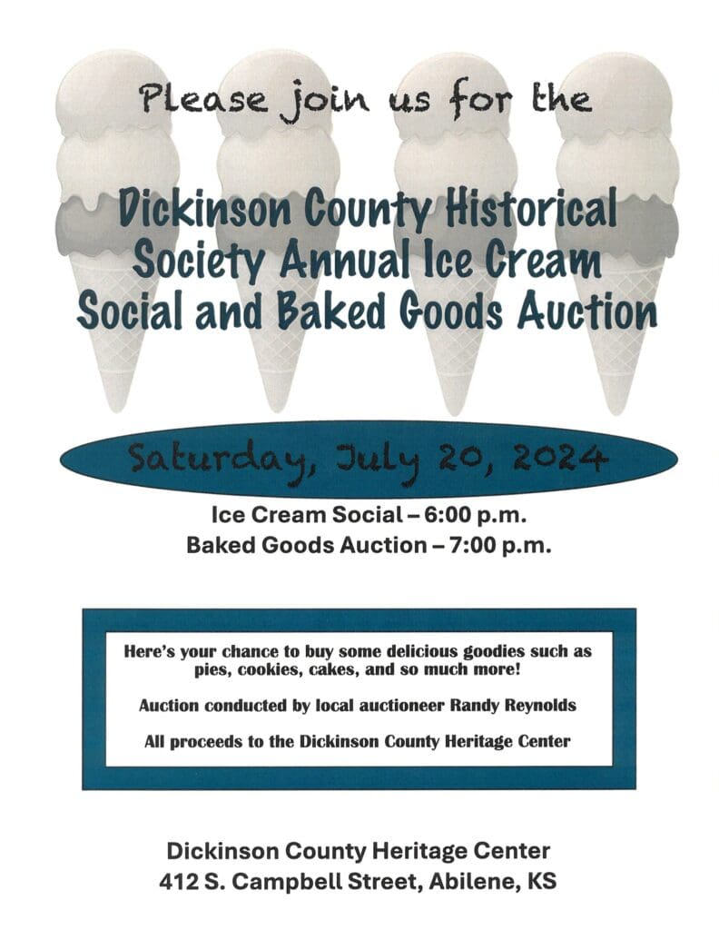 Since 1998 the Dickinson County Historical Society has held an annual Ice Cream Social and Baked Goods Auction Fundraiser during the summer. This year’s Ice Cream Social will be held on Saturday, July 20th at the Dickinson County Heritage Center in Abilene at 6:00 p.m.