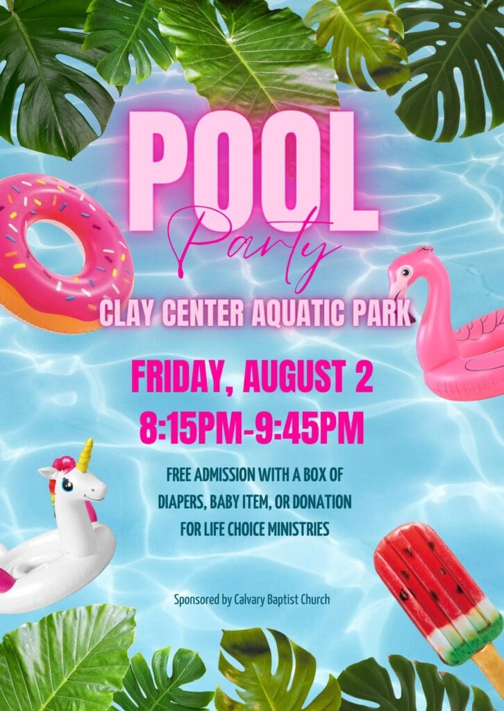The Cavalry Baptist Church in Clay Center will Sponsor its third baby item fundraiser Pool Party on Friday, August 2nd at Clay Center Aquatic Park. The Pool Party will be held from 8:15 to 9:45 p.m. This fundraiser is for Life Choice Ministries, a non-profit organization that provides items and services to expecting mothers, new parents, and more.