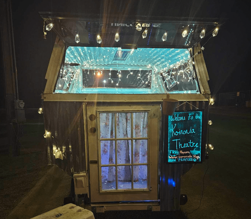 The pair joked that they know they’d “made something cool” when they saw teens taking selfies in front of their concession trailer. Decked out in stringed lights and hosting an old truck topper for a ceiling, the mini-camper also serves as their equipment storage when traveling to/from the movie setup.