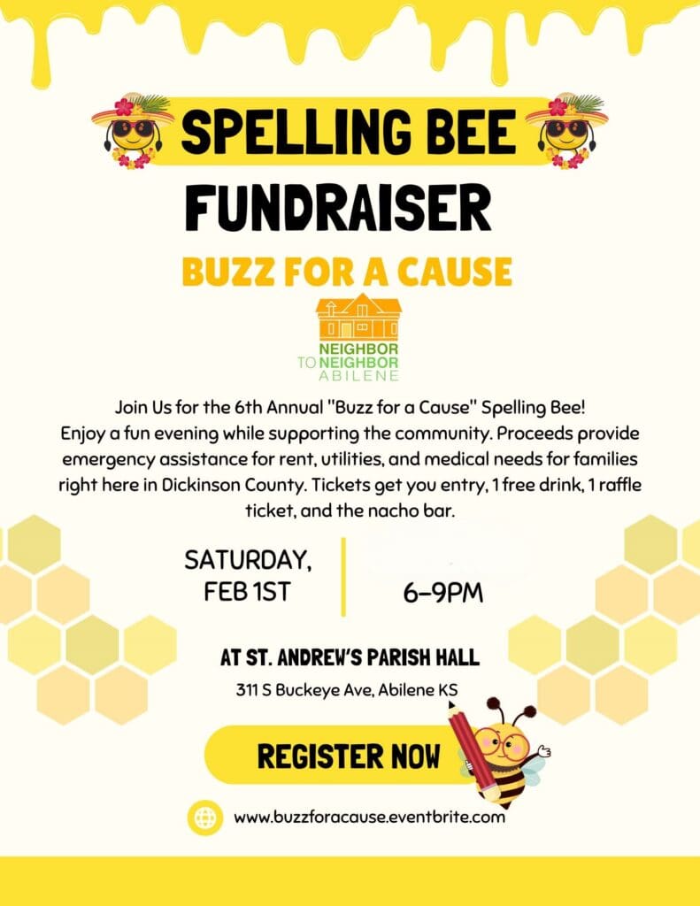 Neighbor to Neighbor of Abilene will host its 6th Annual “Buzz for a Cause” Spelling Bee Fundraiser on Saturday, February 1st at St. Andrews Parish Hall, from 6:00 to 9:00 p.m.