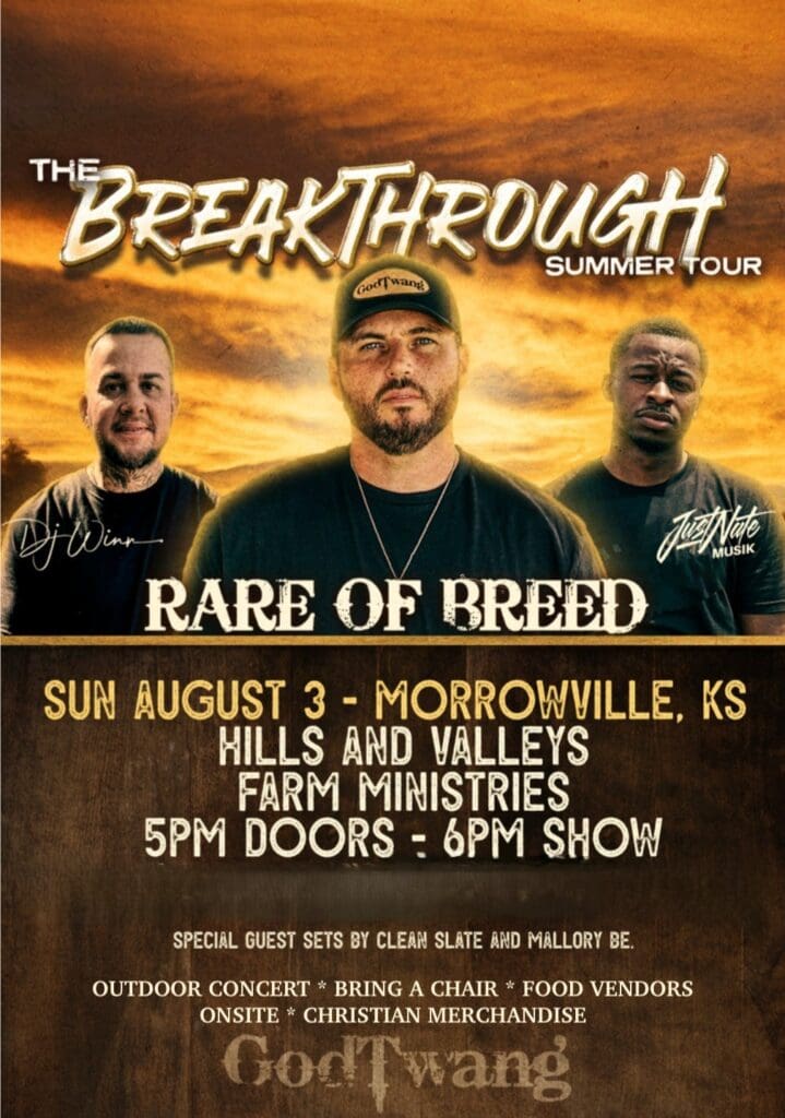 Rare of Breed will bring its talents back to Morrowville on Sunday, August 3rd, as part of its ‘The Breakthrough Tour,’ with guest appearances by Nate Musik and DJ Winn. Being held at Hills and Valley Farm Ministries, doors will open at 5:00 p.m. with the show kicking off at 6:00.
