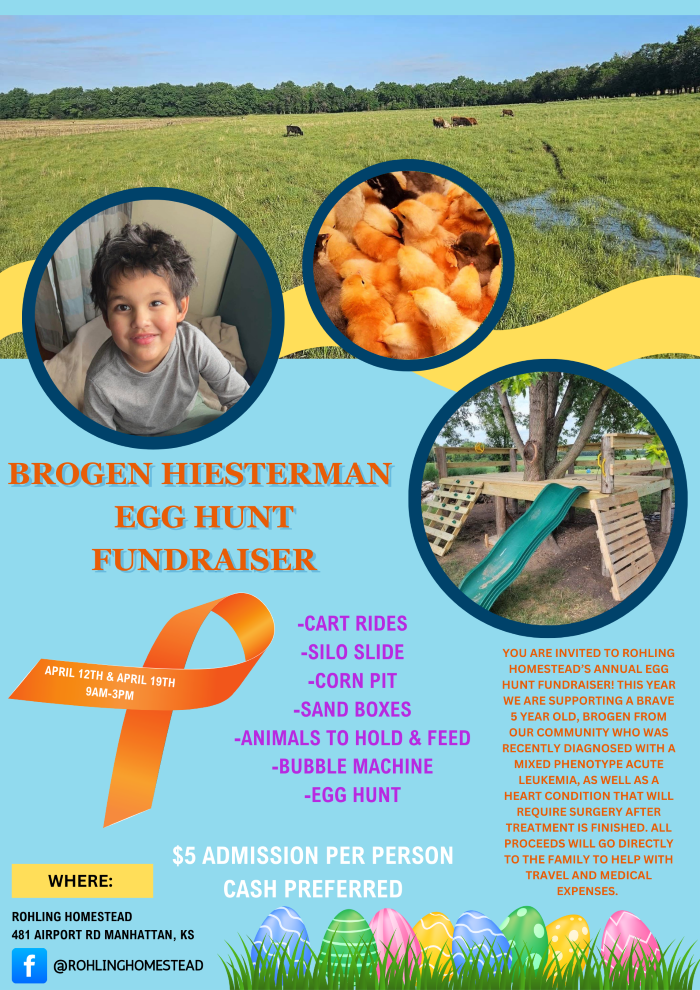 Rohling Homestead, a veteran-owned family farm full of family-friendly activities outside Manhattan, will host its 5th Annual Easter Egg Hunt Fundraiser on Saturdays, April 12th and April 19th, from 9:00 am to 3:00 pm. There will be a large number of different attractions, with all proceeds going to support a family in need.