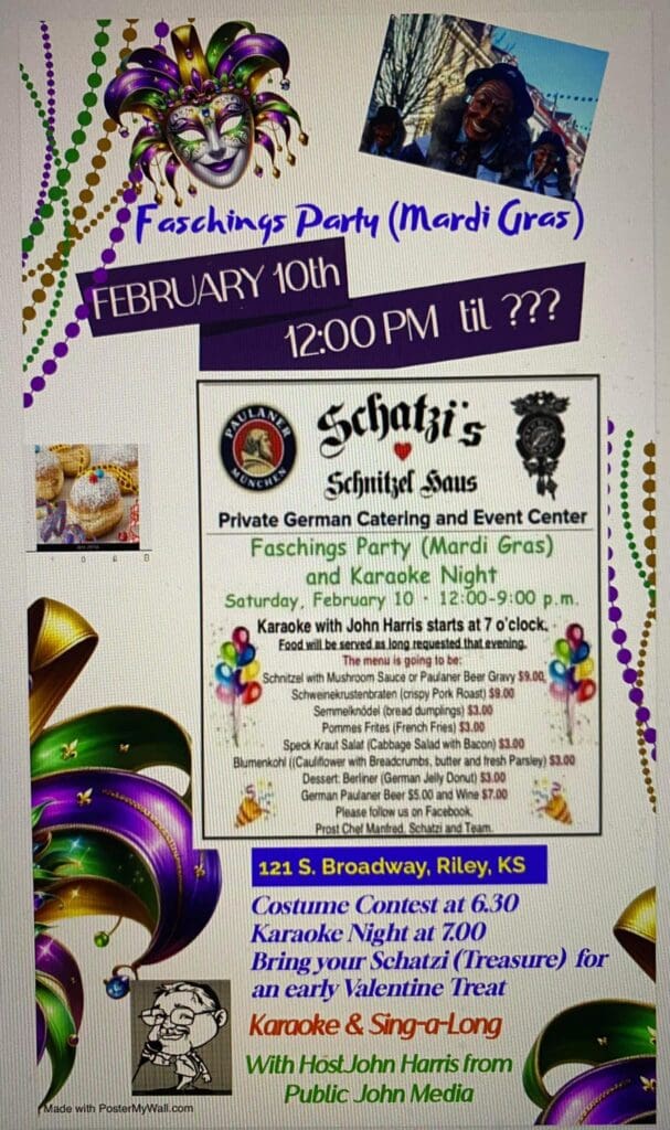Schatzi’s Schnitzel Haus in Riley is throwing a Faschings (Mardi Gras) Party this Saturday, February 10th starting at noon. Manfred Lagrange, Schatzi’s owner, will be serving up authentic German food and has other fun activities planned.