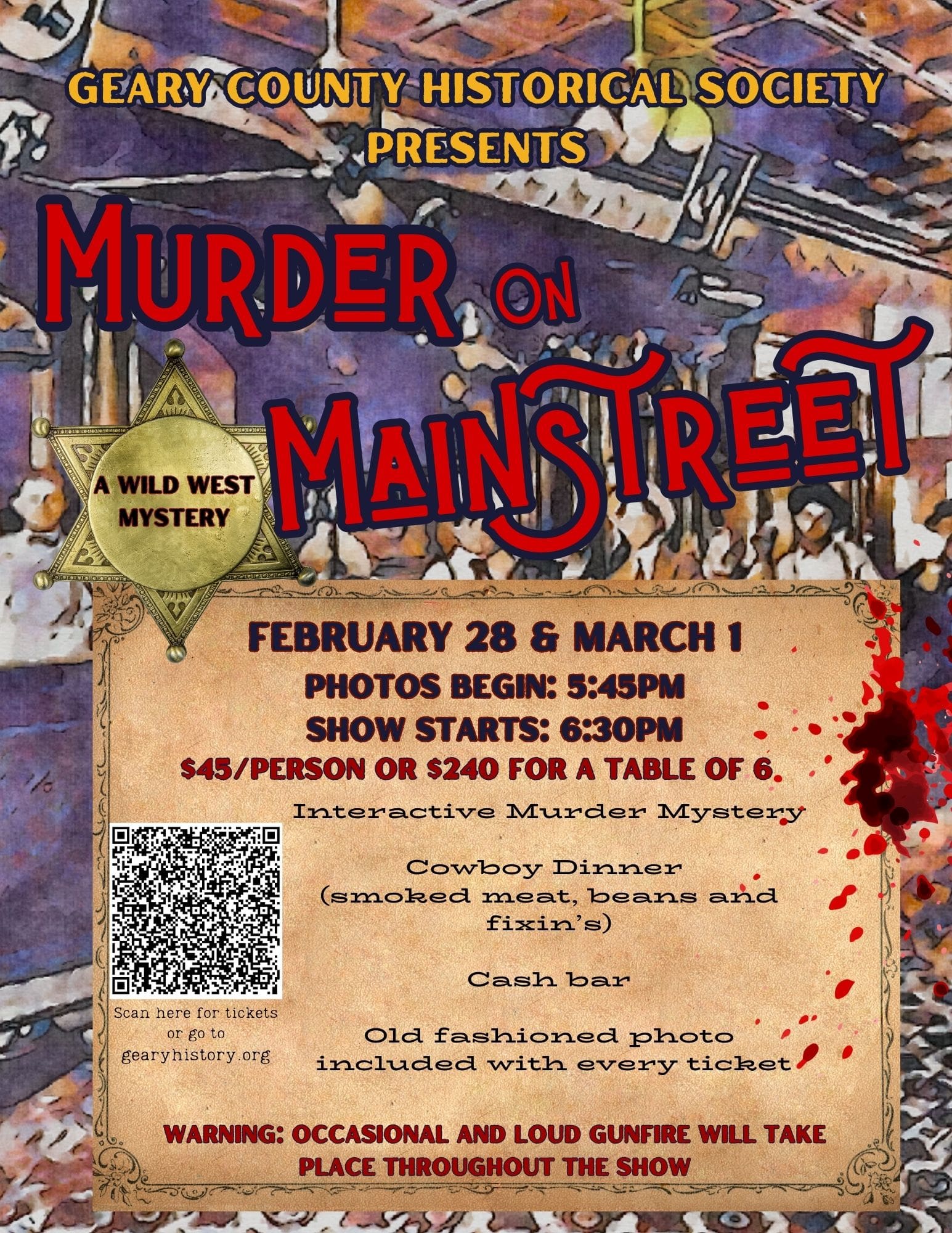Murder on Mainstreet will be held on Friday, February 28th and Saturday, March 1st with doors opening at 5:45 pm and the show beginning at 6:30 pm