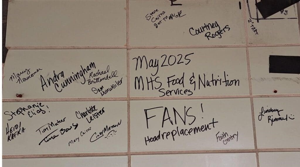 The hood replacement project has been disruptive, yes, but it’s also sparked innovation, camaraderie, and optimism for the future. The kitchen staff made their marks on the wall before the new system started getting attached. “In 50 years, when they tear this hood down to replace it, they’ll know we were all here,” Andra chuckled. Although, the kitchen staff is eager to get their space back and start cooking again, they have learned through this process that they have a great team that can tackle some big hurdles together!