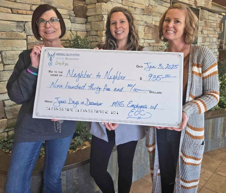 Employees of Memorial Health System (MHS) wore blue jeans at work for another “Jeans Day” fundraiser on Fridays throughout the month of December. Employees make a donation, of at least $5, and are allowed to wear blue jeans at work. A total donation of $935 was presented to Neighbor to Neighbor in Abilene.