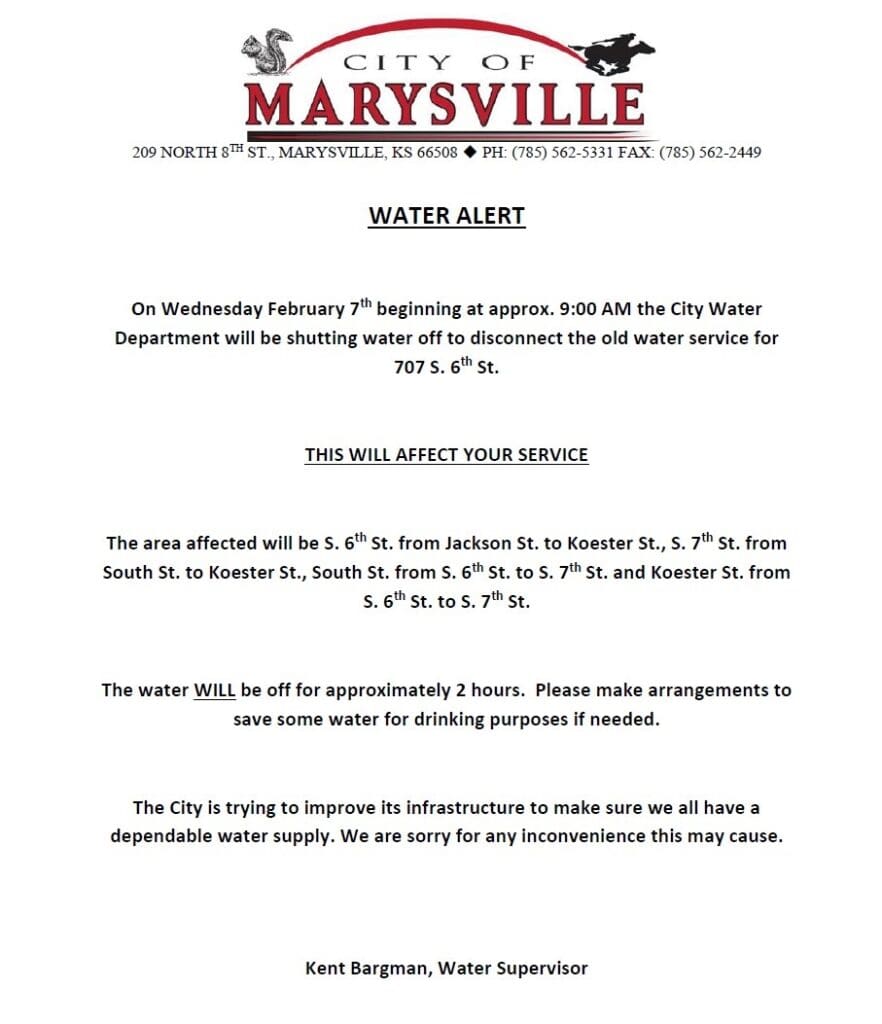 Starting at 9:00 am today the Marysville City Water Department will be temporarily shutting off water service for parts of south 6th and 7th street. Water will be off for approximately 2 hours according to their Facebook page.