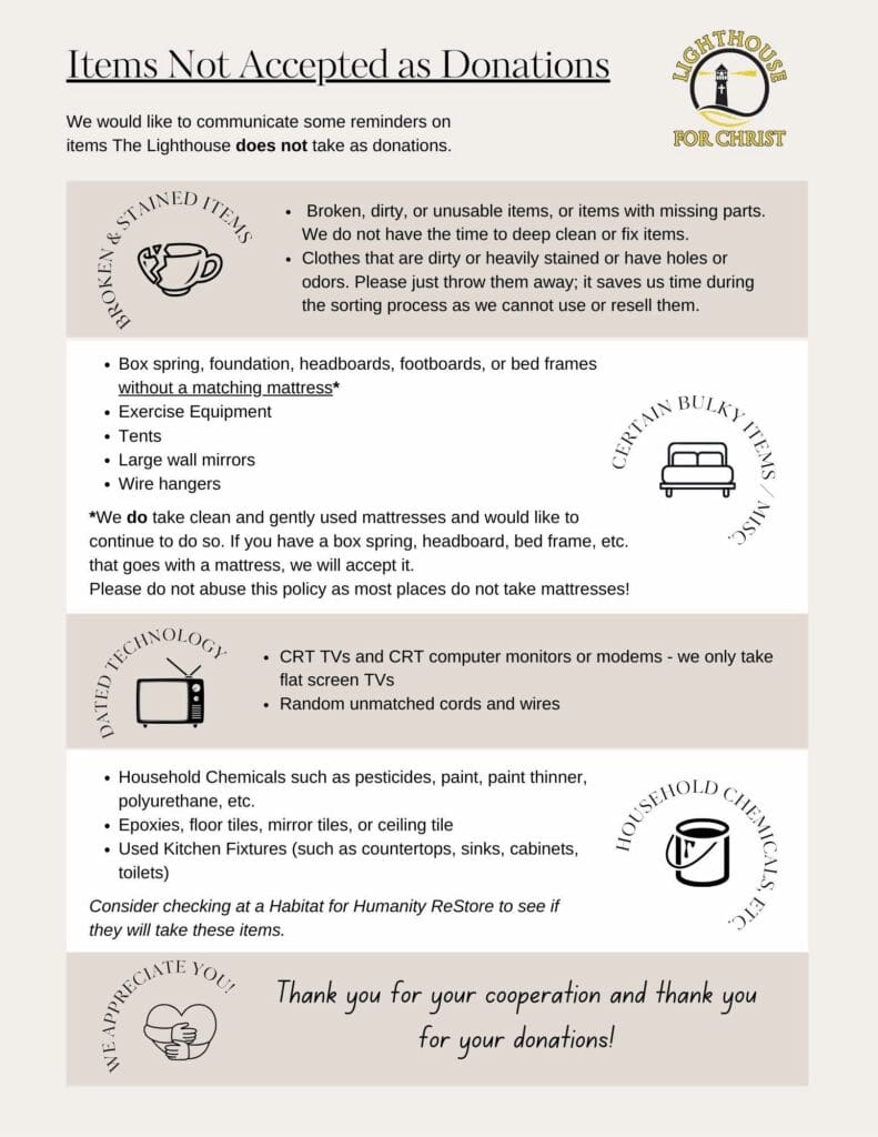 Please remember that nearly all of our team are unpaid volunteers doing their best to serve the community. Also, be sure to remove any garage sale stickers before donating.