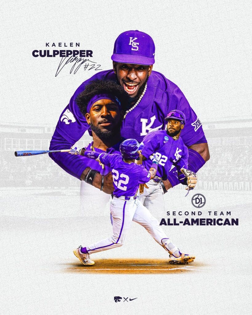 Culpepper hit for the cycle in K-State’s NCAA Tournament opener against Louisiana Tech. His standout performance included a .474 batting average, .522 on-base percentage, and 1.053 slugging percentage during the tournament. This accolade is the 39th postseason All-America honor in program history and Culpepper’s first.