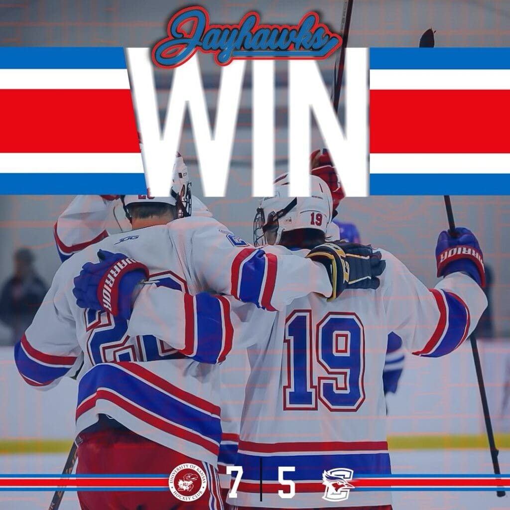 In the second matchup, the Jayhawks bounced back for a 7-5 victory. Brett Siddons recorded a hat trick (when a player scores three goals in a single game), helping Kansas build a 6-3 lead by the end of the second. Jackson Fischer scored a crucial insurance goal (a goal giving a team a two-point lead over the opposing team) in the third to make it 7-5. Goalie Kai Vetter made key stops down the stretch to preserve the win. The Jayhawks’ next series is scheduled for October 18-19 against Dordt University.