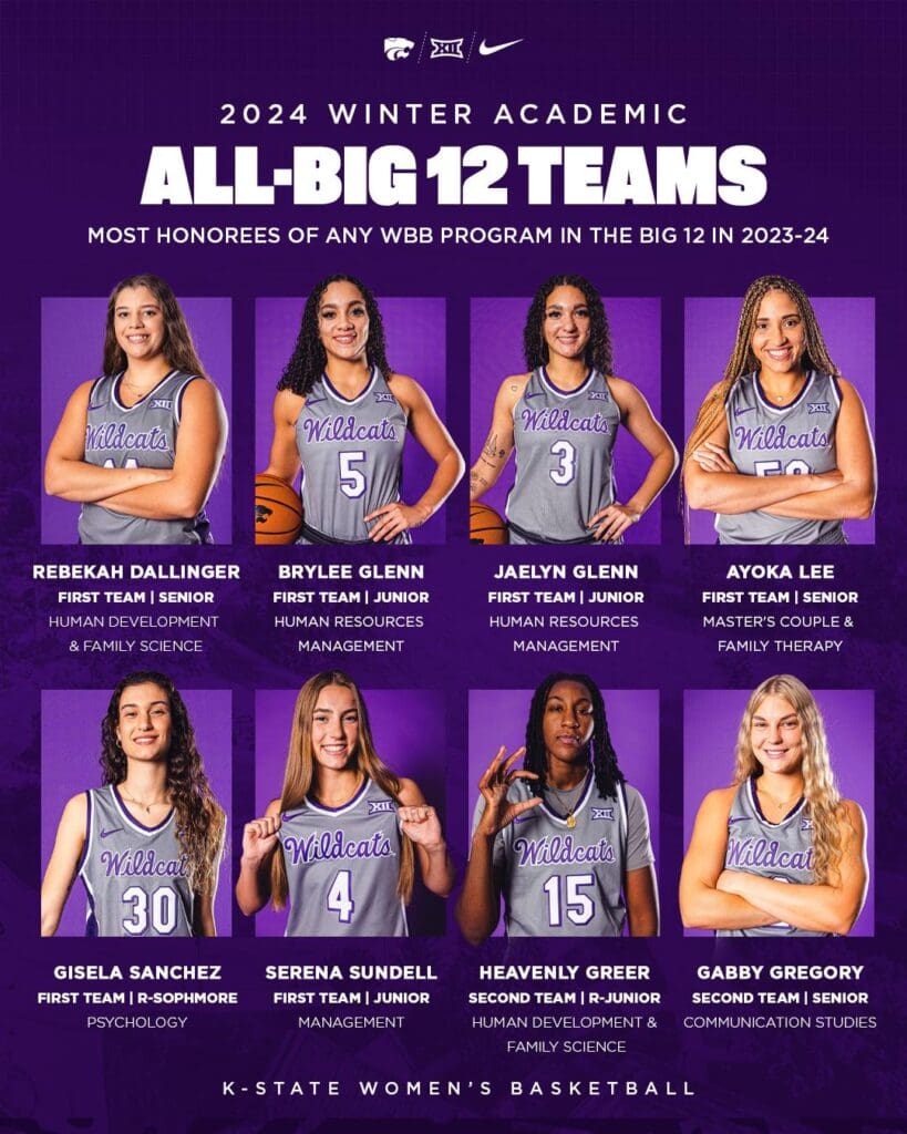 MANHATTAN, Kansas – Kansas State women’s basketball placed eight student-athletes on the 2024 Winter Academic All-Big 12 Teams, as announced by the Big 12 Conference on Tuesday. This is the highest number of academic selections for the program since the 2016-17 season, leading the Big 12 in women’s basketball academic honors.