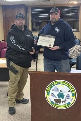 During Chapman’s recent City Council meeting, Chief of Police Reynolds presented Fire Chief Nick Saunto and Captain Craig Klukas with the “Citizens Life Saving Award”