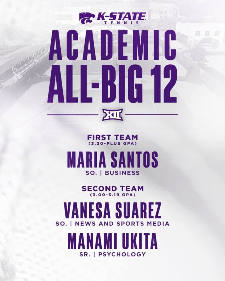 By Jayson Henderson On Tuesday, the K-State women’s tennis team had three players recognized on the Academic All-Big 12 Teams. Maria Santos, Vanesa Suarez, and