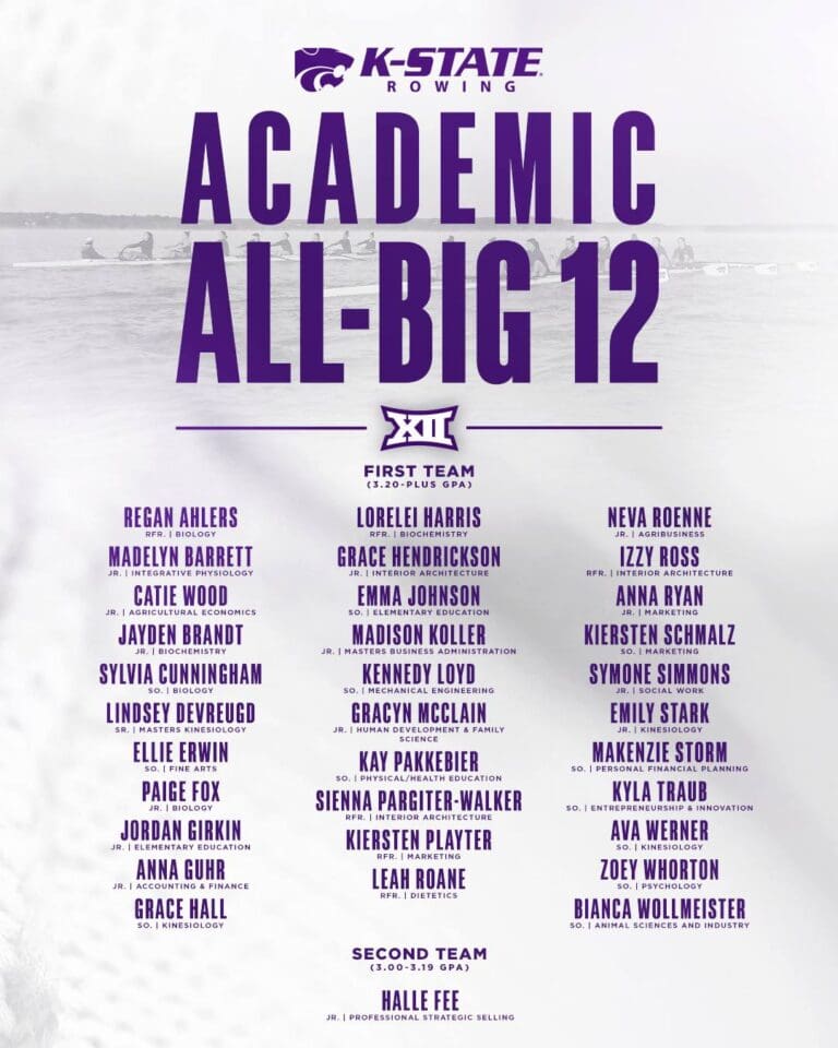 By Jayson Henderson The K-State women’s rowing team earned 33 Academic All-Big 12 Team honors on Tuesday, as announced by the Big 12. K-State tied