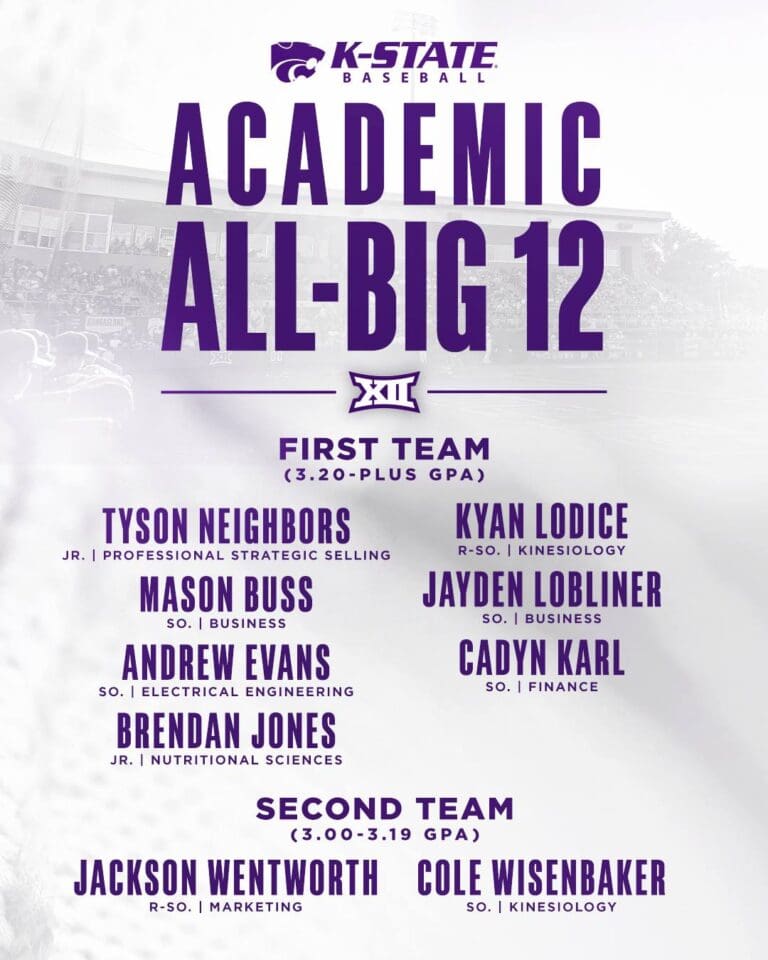 By Jayson Henderson K-State had nine student-athletes named to the 2024 Academic All-Big 12 Baseball Teams, as announced by the conference office on Tuesday. Seven