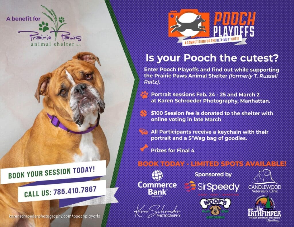 For the 3rd year, Karen Schroeder of Karen Schroeder Photography in Manhattan is hosting her Pooch Playoffs Competition to benefit Prairie Paws Animal Shelter.