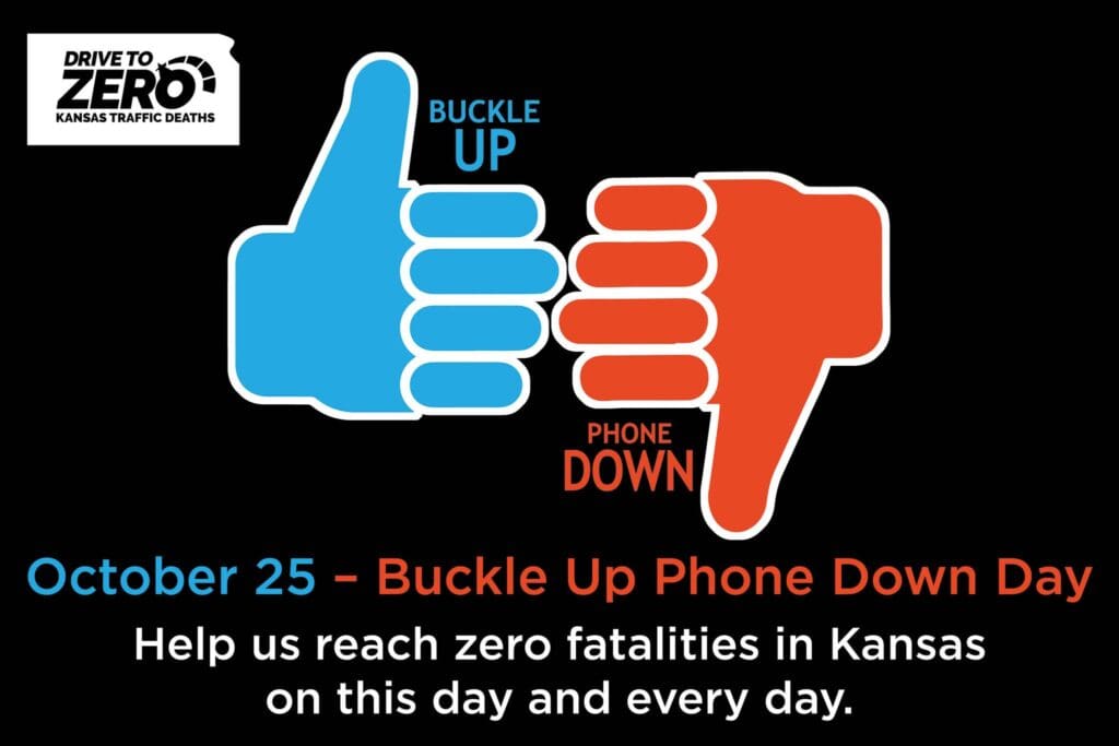 Wednesday, October 25th is Buckle Up, Phone Down Day. The Kansas Department of Transportation (KDOT) and the Drive to Zero Coalition are teaming up to challenge all drivers to put aside distractions and focus on safety. The goal is to reduce traffic fatalities and bring awareness to the importance of putting the phone down and buckling up.