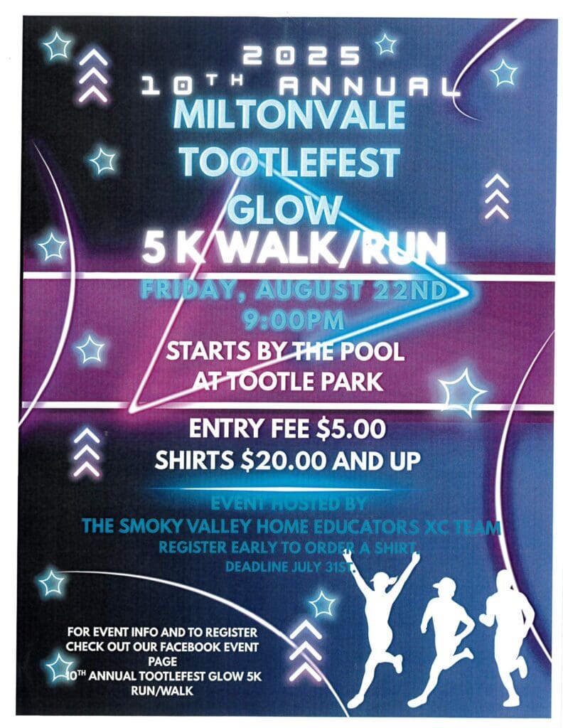 On Friday, August 22nd, at 9:00 pm, glow sticks will light up the town of Miltonvale. This year marks the town’s 10th Annual Glow Race. This 5k Walk/Run is held on Friday night during Tootlefest, a 3-day event that has a parade, car show, and more.
