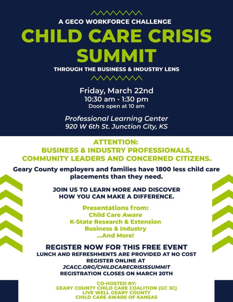 The Geary County K-State Research & Extension Office in partnership with the Geary County Childcare Coalition will be holding a Childcare Crisis Summit on Friday, March 22nd in Junction City. The Summit will take place at the USD 475 Professional Learning Center from 10:00 a.m. to 1 p.m.