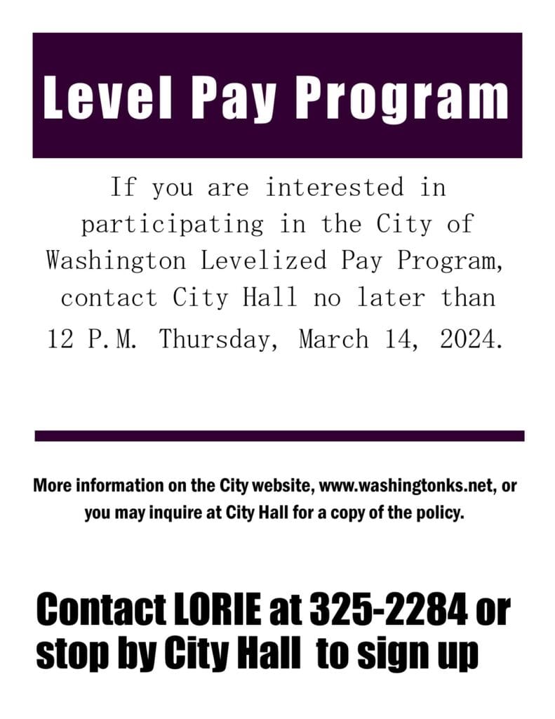 The City of Washington is asking residents who are interested in participating in the Utility Level Pay Program to contact City Hall no later than March 14th by noon.