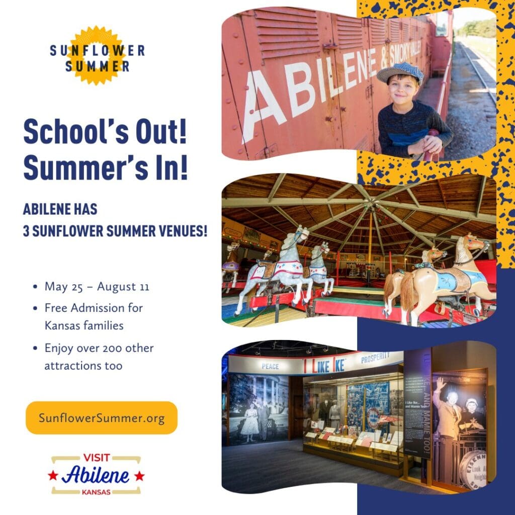 The Abilene Convention & Visitors Bureau proudly announces the participation of three iconic Abilene attractions in the 2024 Kansas Tourism Sunflower Summer program. The Abilene & Smoky Valley Railroad, Dickinson County Heritage Center, and Eisenhower Presidential Library and Museum invite Kansas families to explore and discover the beauty and history of Abilene.